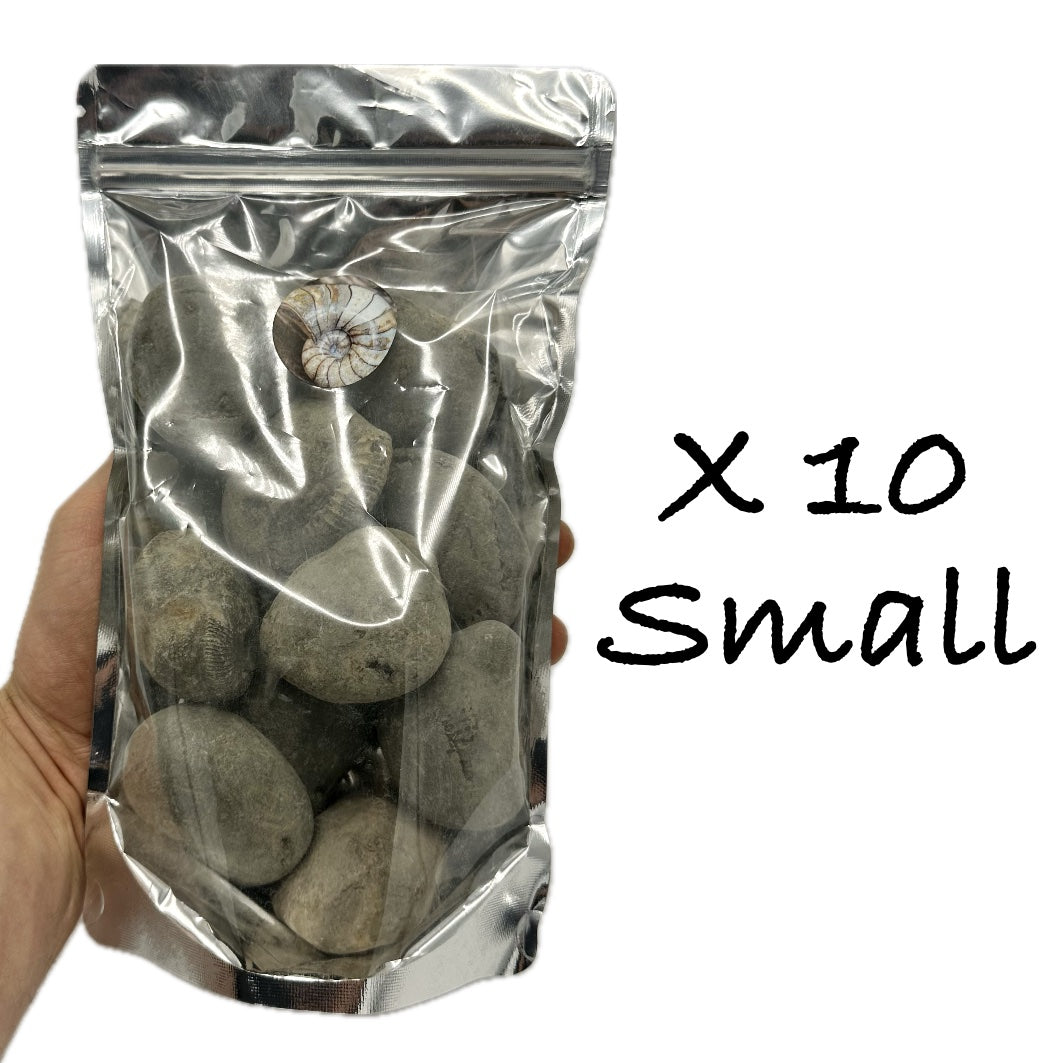 10 randomly selected small nodules with guaranteed ammonites. (SIMILAR TO SEEN) We send bundles of nodules rather than singular specimens to maximise your chances of success. Whilst we select the specimens most likely to split we cannot guarantee every nodule will open perfectly. Ammonite nodules are non-refundable after purchase.