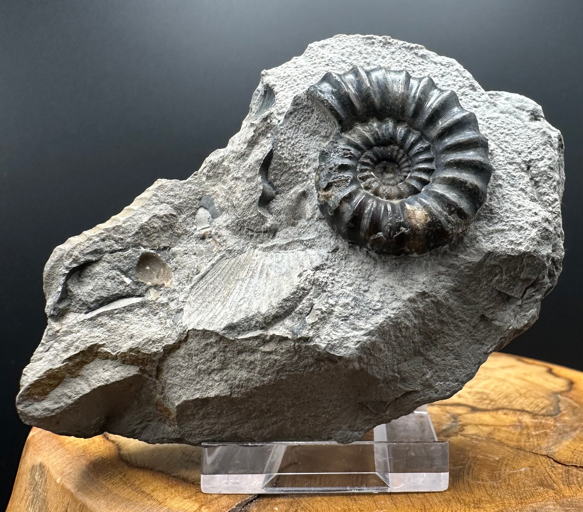 Androgynoceras maculatum ammonite fossil with box and stand - Whitby, North Yorkshire Jurassic Coast Yorkshire Fossils
