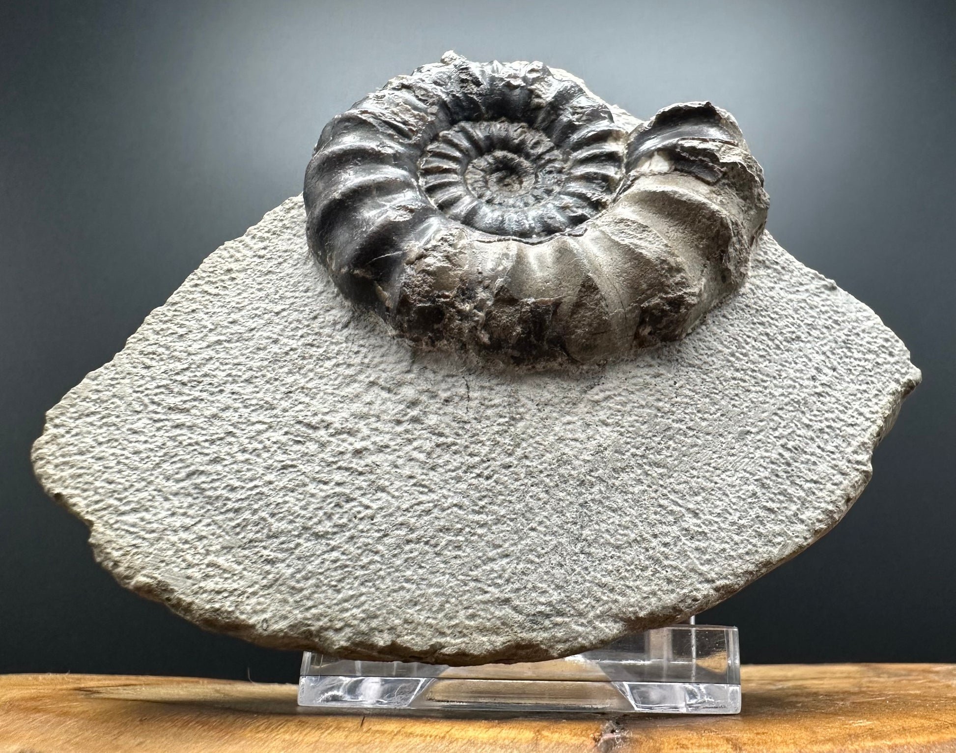 Androgynoceras maculatum ammonite fossil with box and stand - Whitby, North Yorkshire Jurassic Coast Yorkshire Fossils