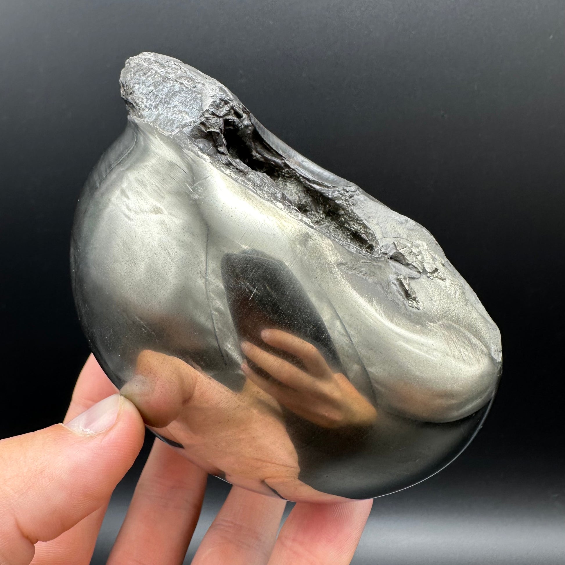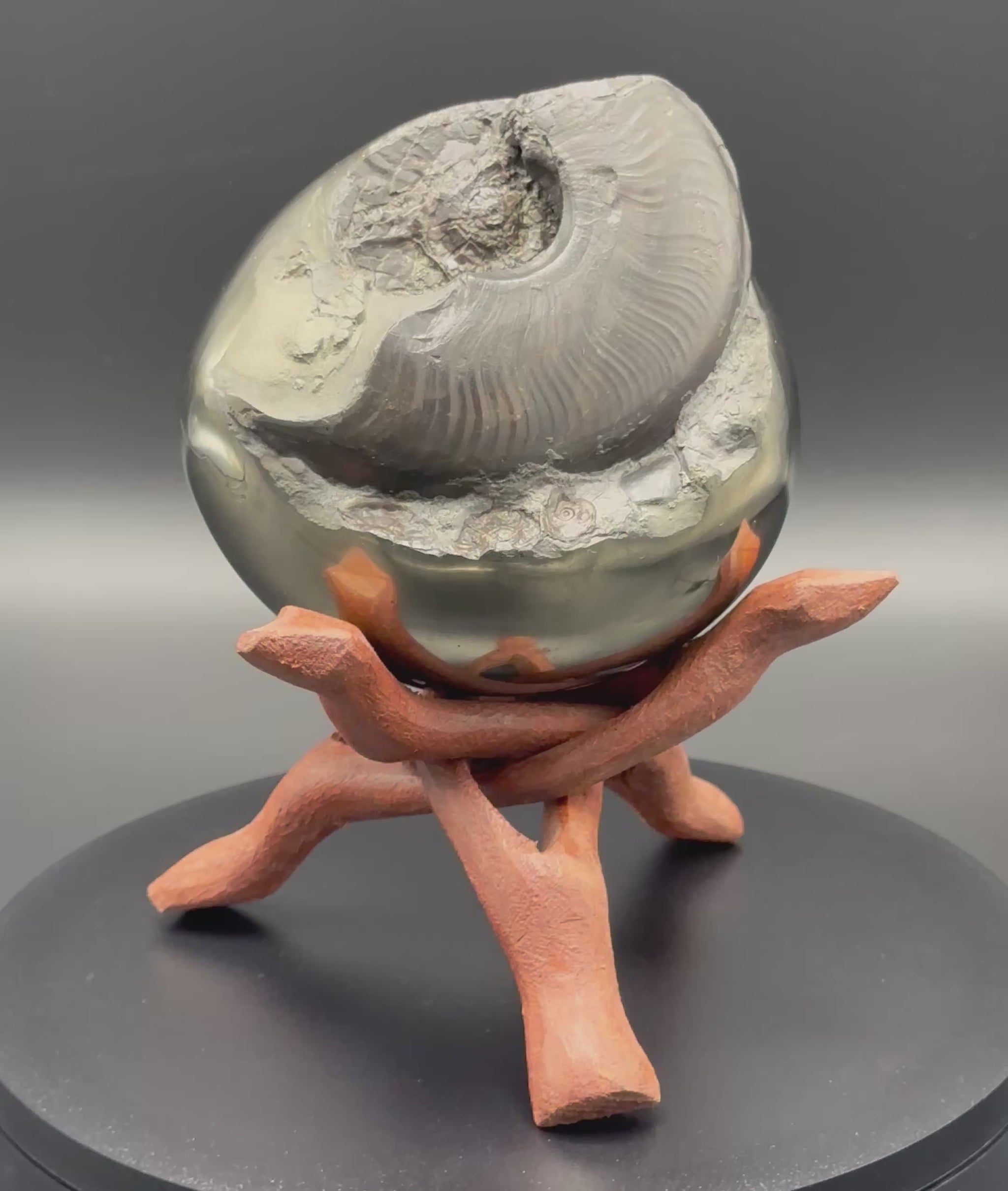 Golden Eggs are rare fossil bearing limestone nodules with a naturally occurring iron pyrite shell, commonly known as “fools gold”. Few nodules contain the Eleganticeras elegantulum ammonites we expect to see and even fewer are good enough to reach the final polishing process. The polishing stage takes many hours but eventually we are left with this luxurious golden shine.