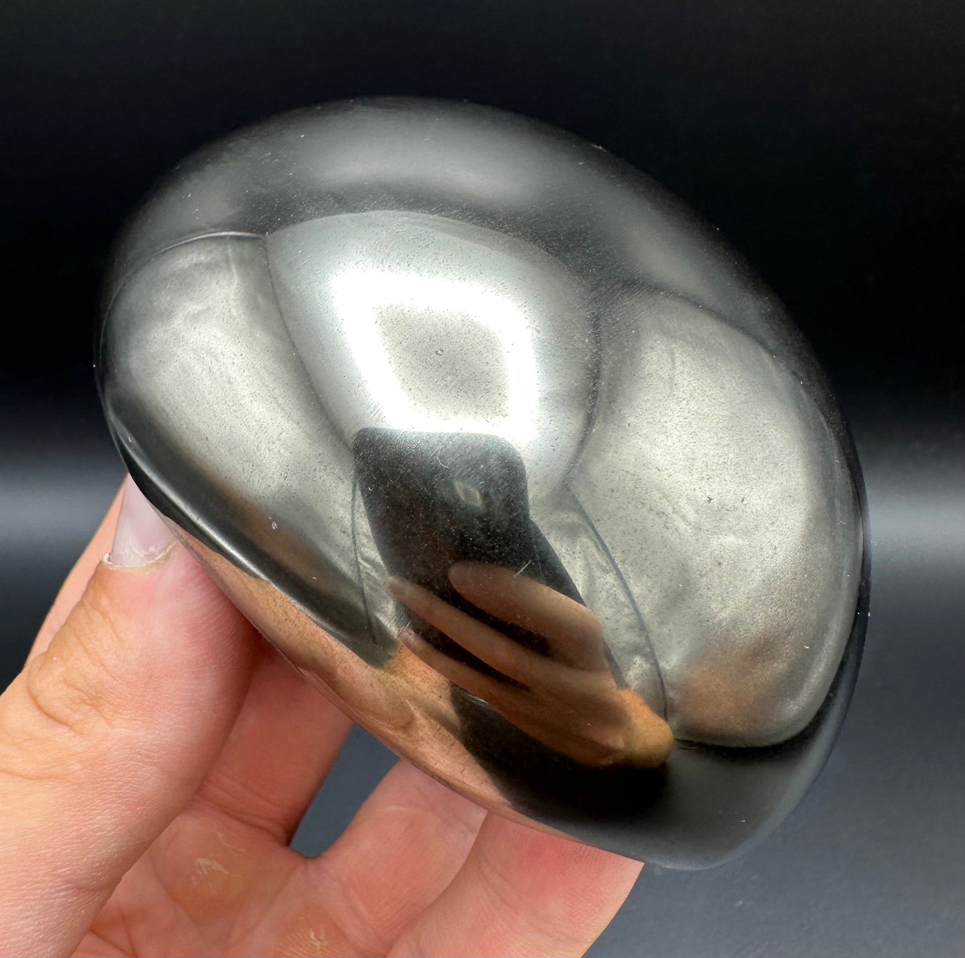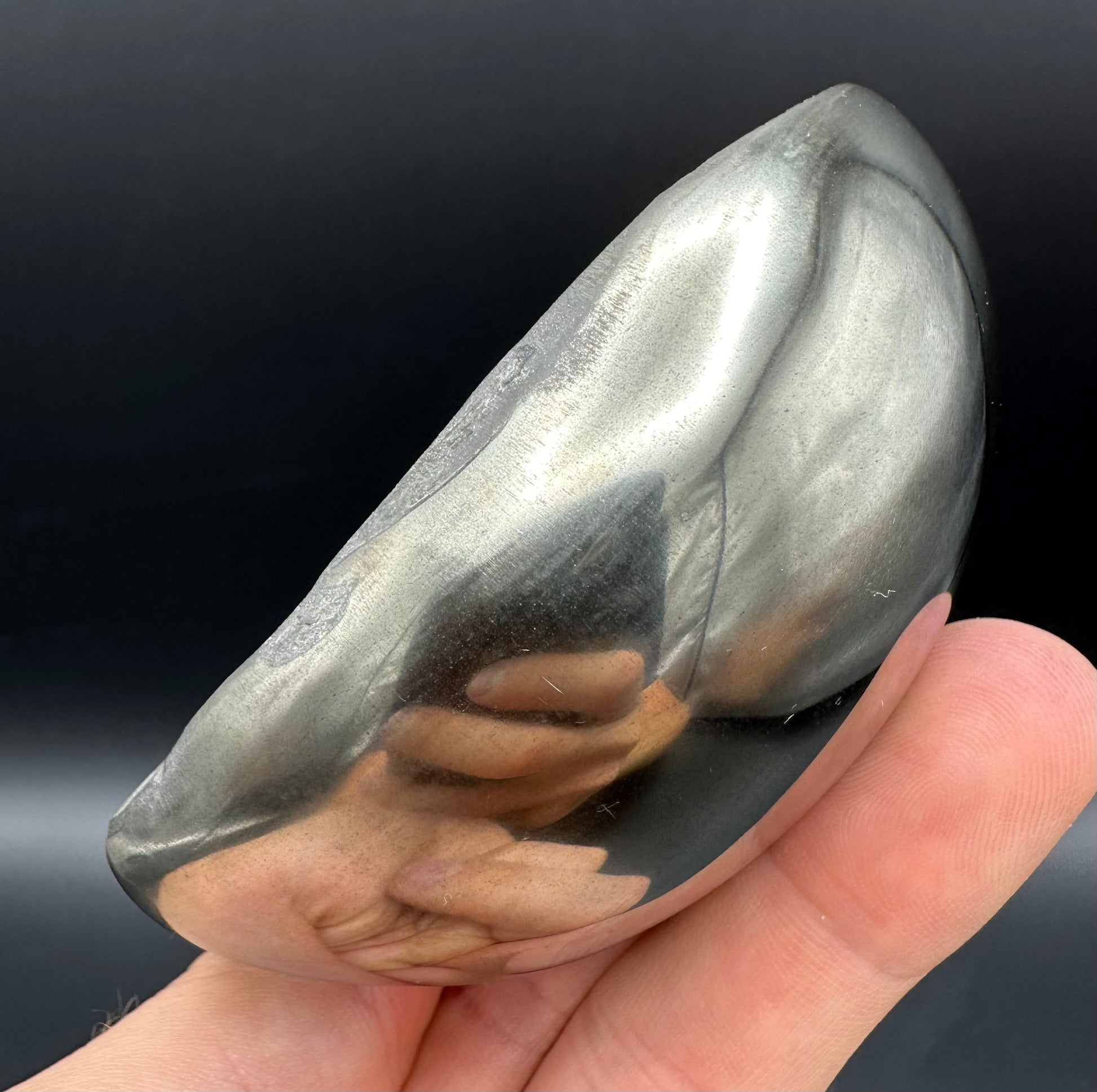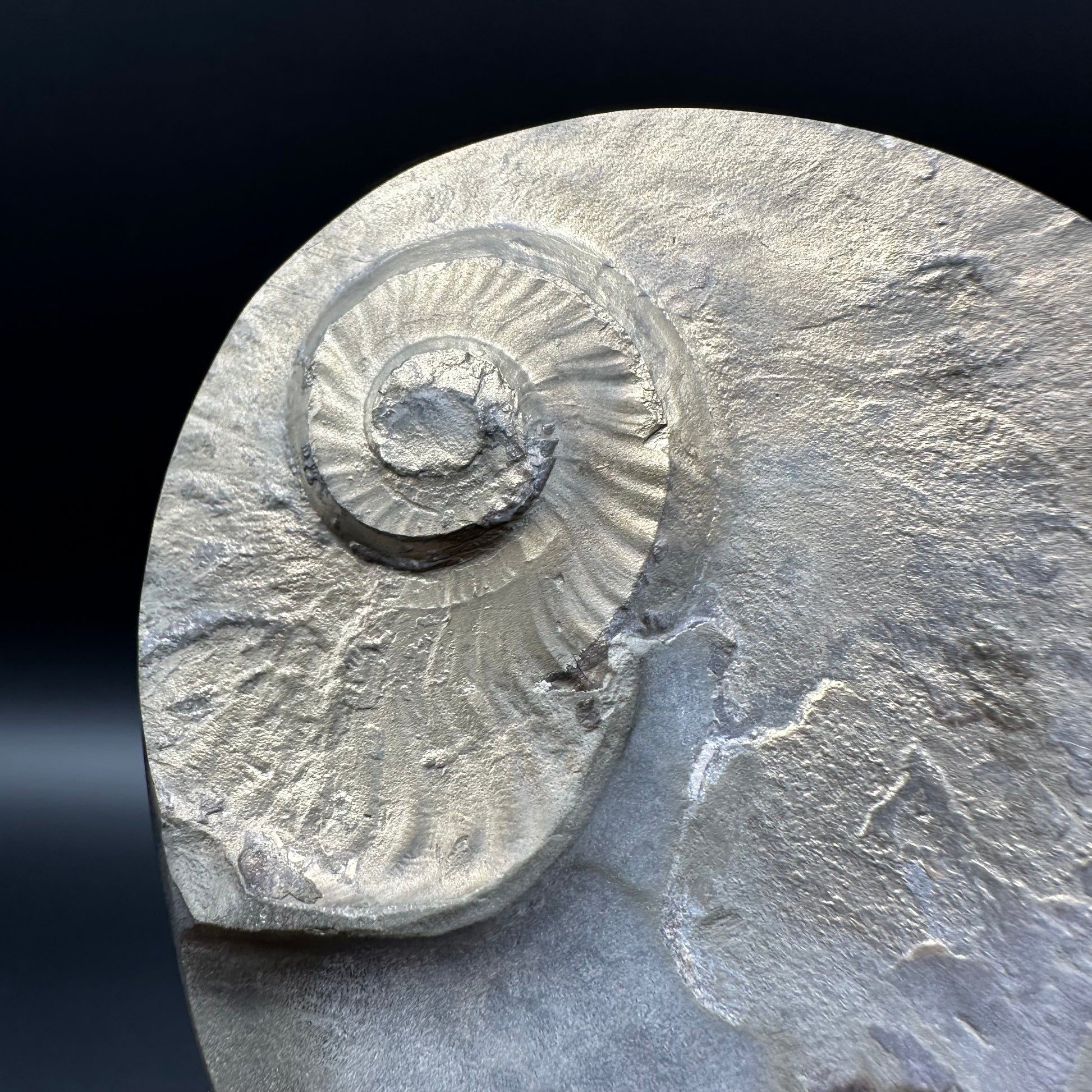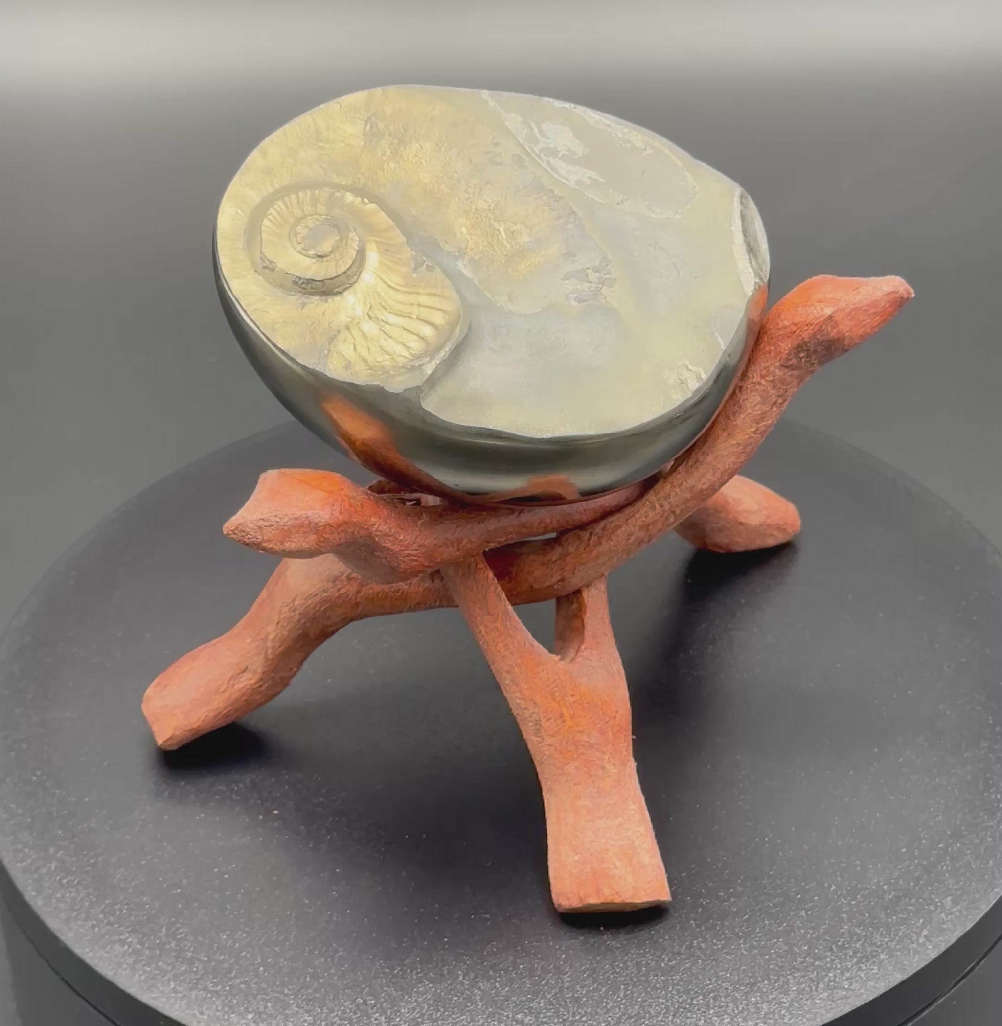 Golden Eggs are rare fossil bearing limestone nodules with a naturally occurring iron pyrite shell, commonly known as “fools gold”. Few nodules contain the Eleganticeras elegantulum ammonites we expect to see and even fewer are good enough to reach the final polishing process. The polishing stage takes many hours but eventually we are left with this luxurious golden shine.
