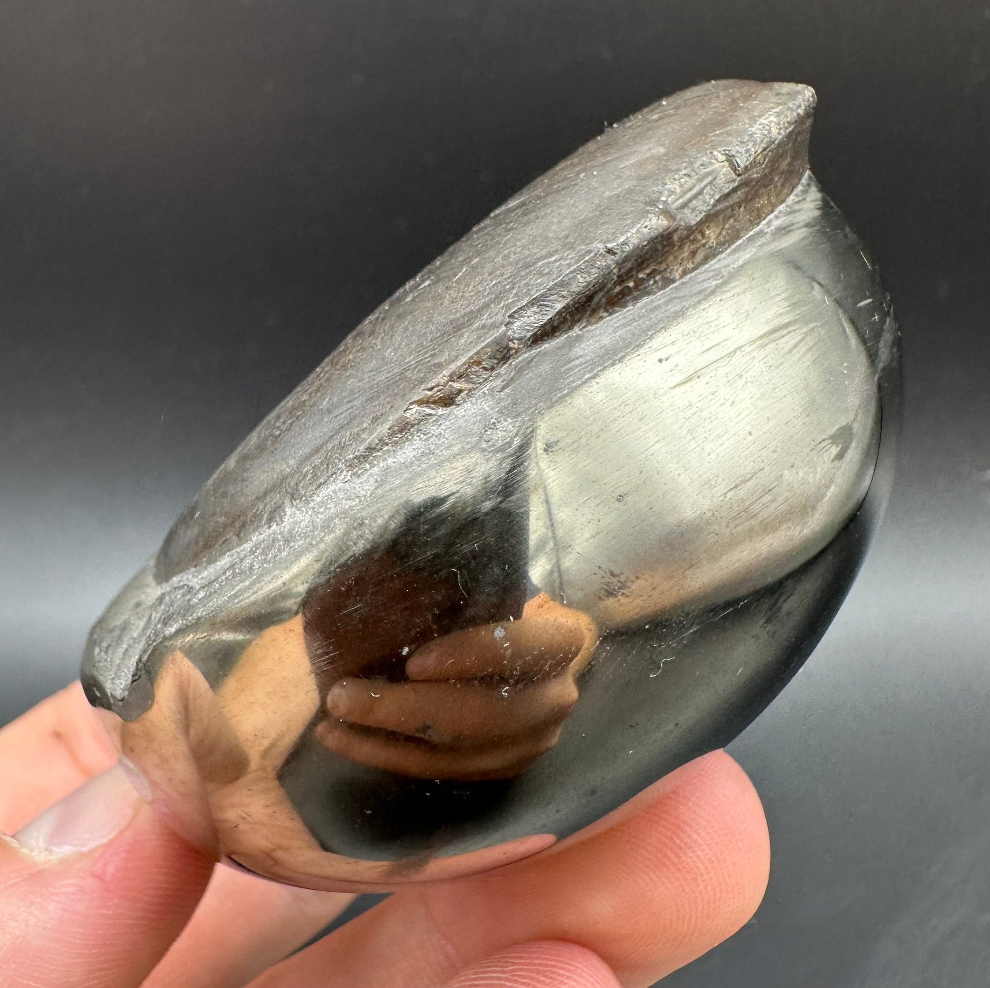 As these specimens are so hard to come by we have also taken the time to prepare some IMPLANT specimens where we have taken a Yorkshire or Madagascan ammonite or bone and set it into one of the empty Golden Egg nodules. Each specimen will be labelled with either (GENUINE) or (IMPLANT) so you know whether you are looking at a natural ammonite in the rock or one we have set into the stone. Both take an equal amount of time to prepare and are amazing display and conversations pieces. Each specimen will come with an information sheet and a polishing cloth to keep your fossil in great condition. Before handling the specimen we recommend either washing your hands or wearing gloves to avoid grease marks and tarnishing the polished pyrite layer to keep the specimen in the best condition possible. Also, avoid getting the specimen wet or storing in a damp environment, keep dry to keep the specimen in the best condition.