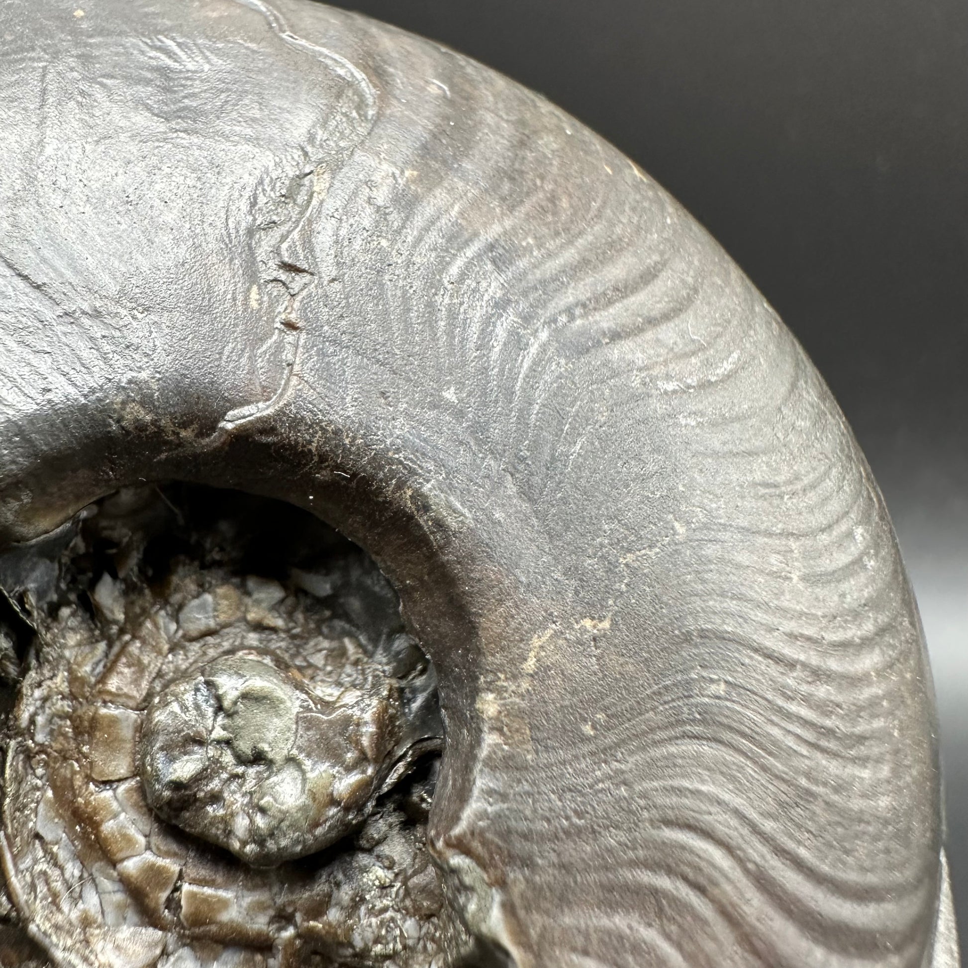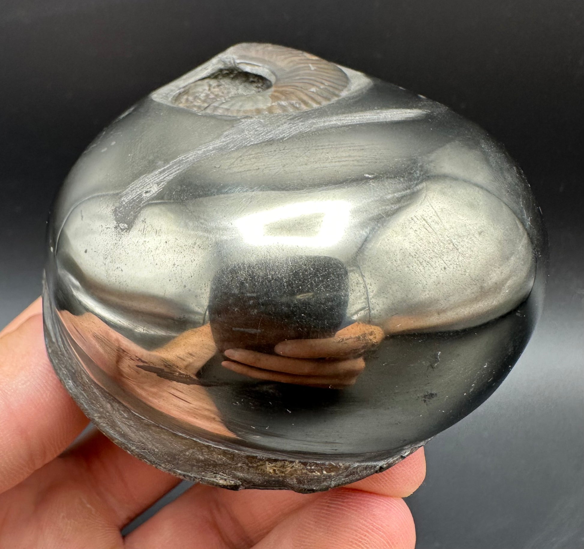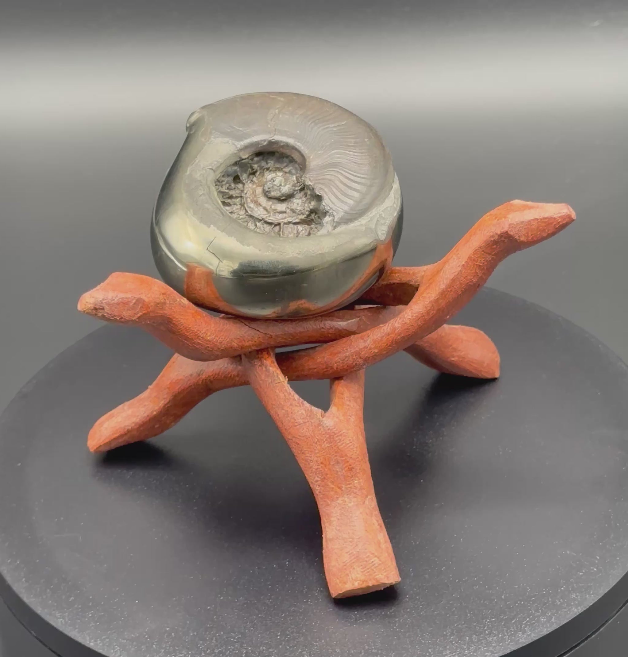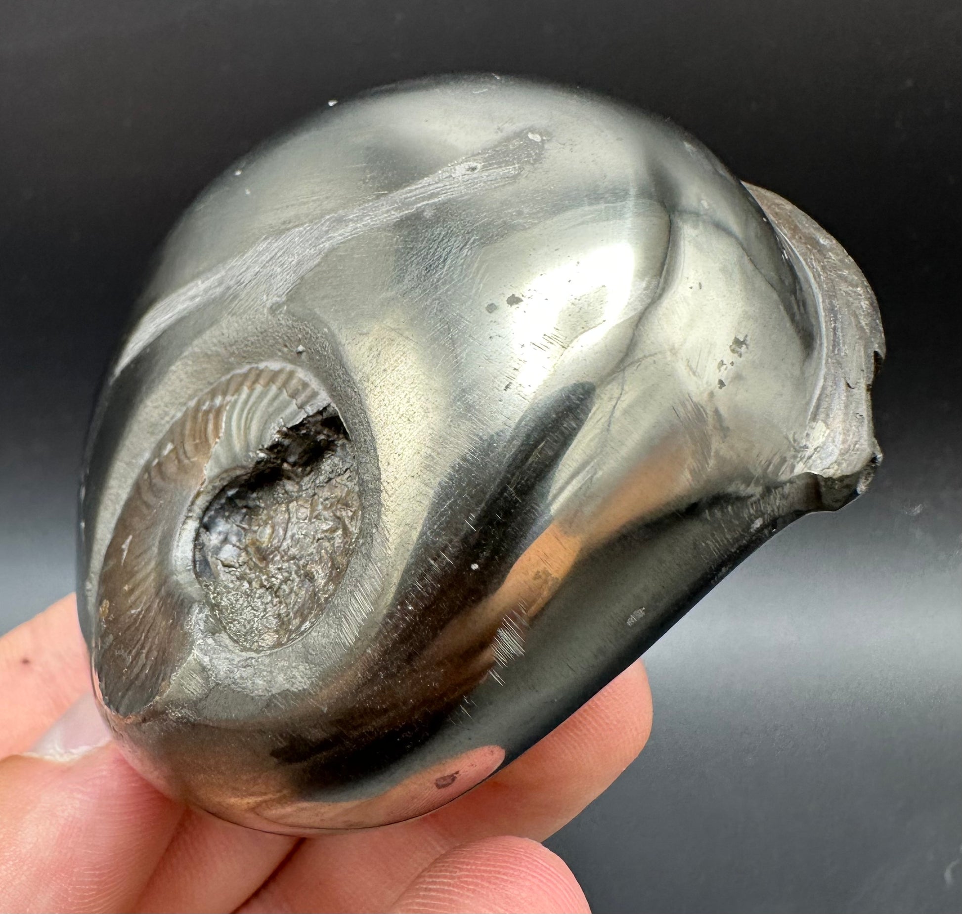 Golden Eggs are rare fossil bearing limestone nodules with a naturally occurring iron pyrite shell, commonly known as “fools gold”. Few nodules contain the Eleganticeras elegantulum ammonites we expect to see and even fewer are good enough to reach the final polishing process. The polishing stage takes many hours but eventually we are left with this luxurious golden shine.