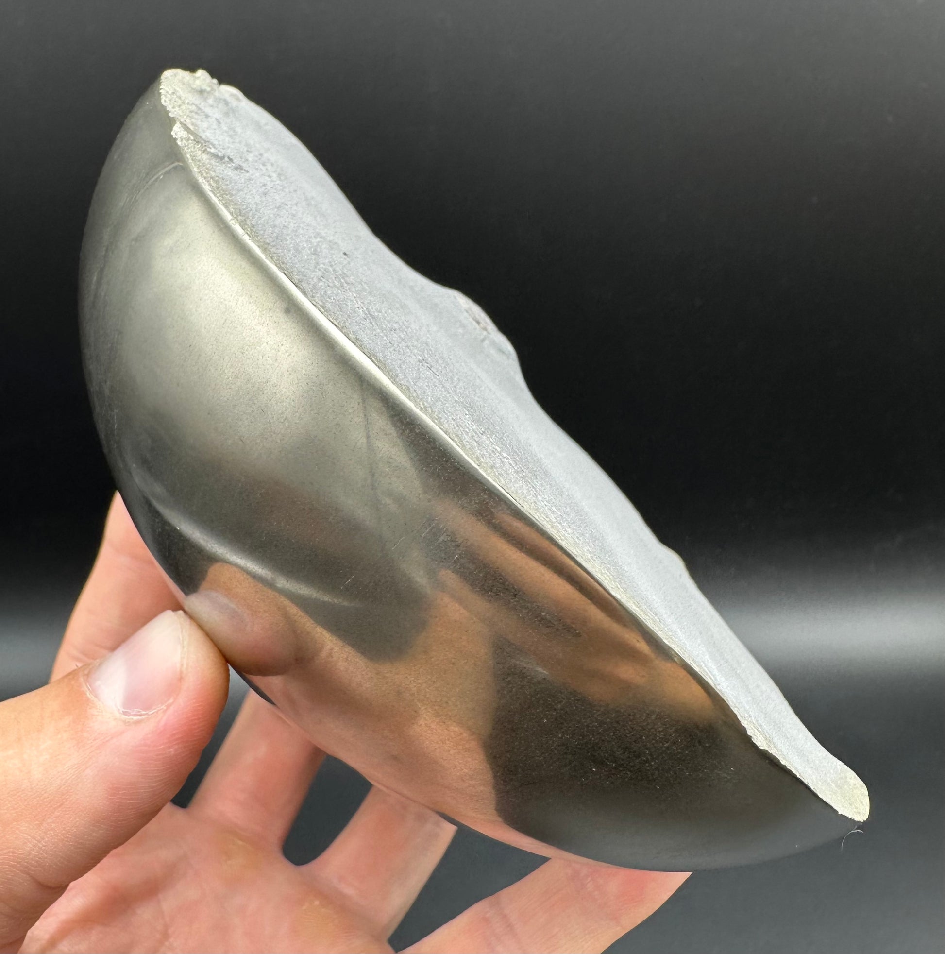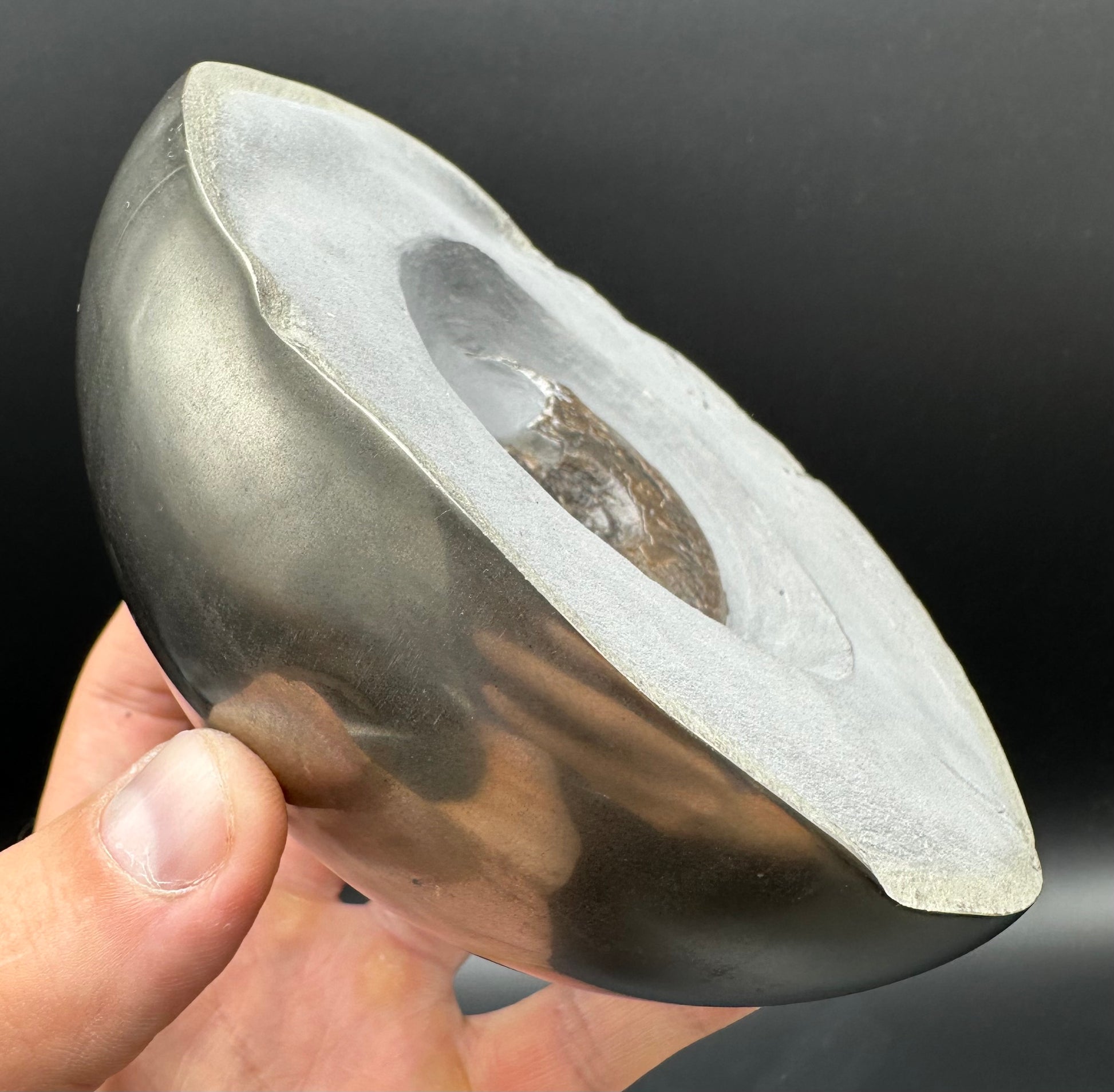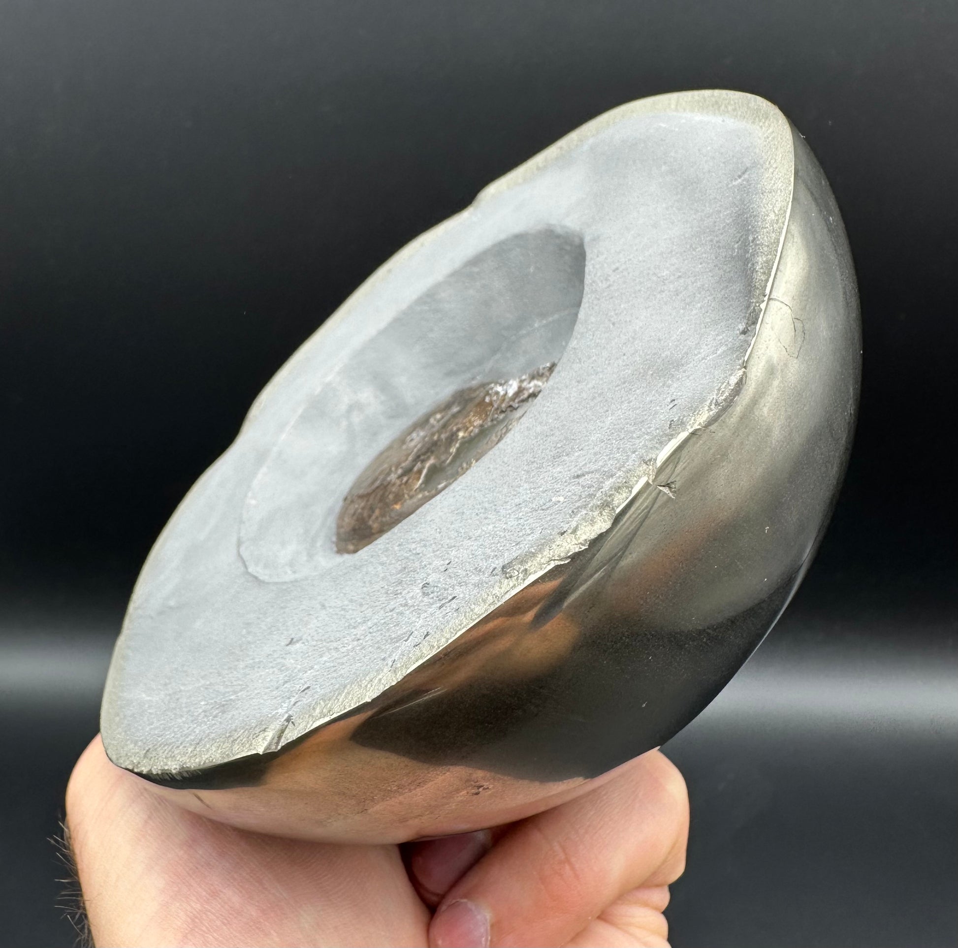 Golden Eggs are rare fossil bearing limestone nodules with a naturally occurring iron pyrite shell, commonly known as “fools gold”. Few nodules contain the Eleganticeras elegantulum ammonites we expect to see and even fewer are good enough to reach the final polishing process. The polishing stage takes many hours but eventually we are left with this luxurious golden shine.