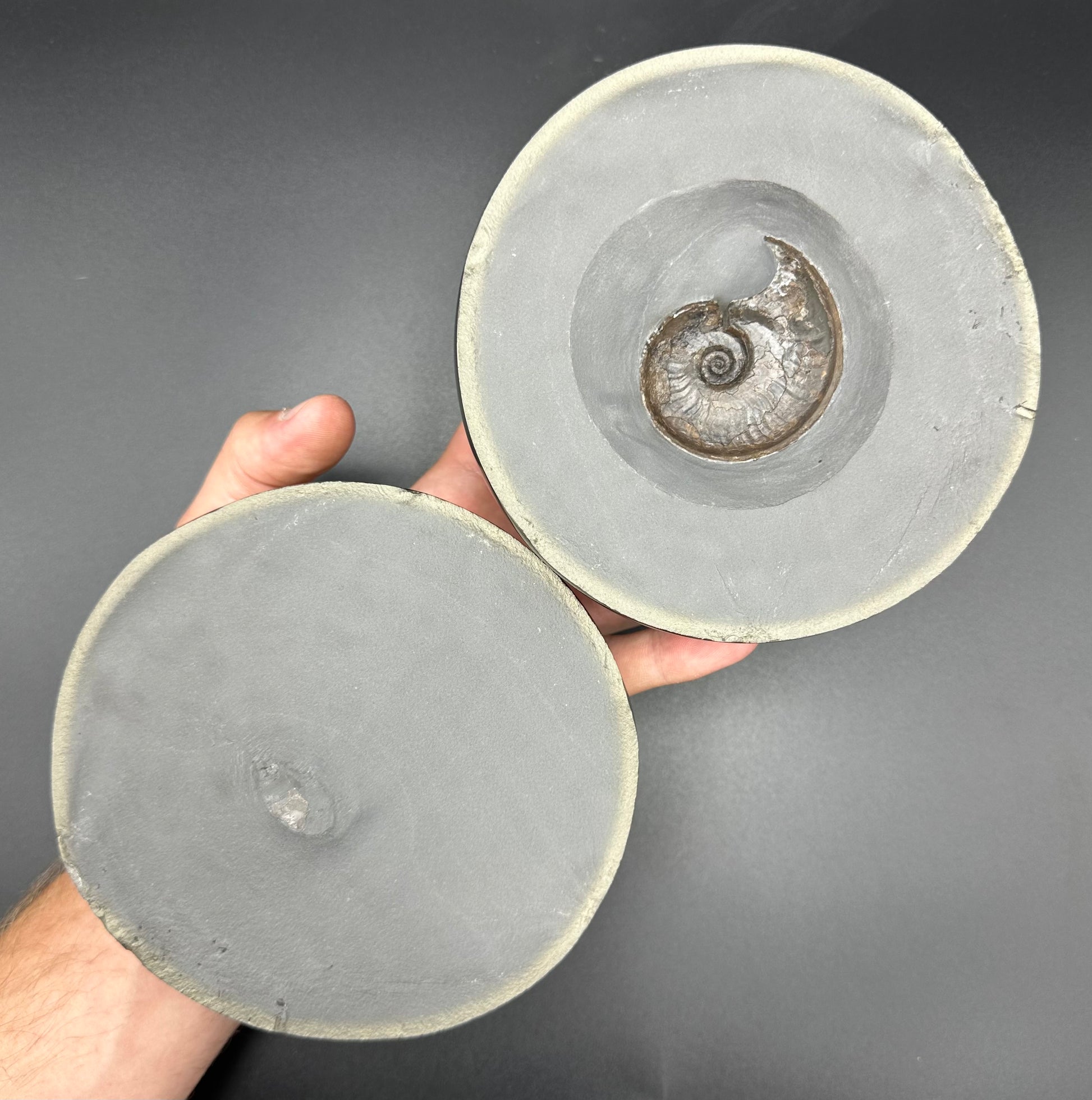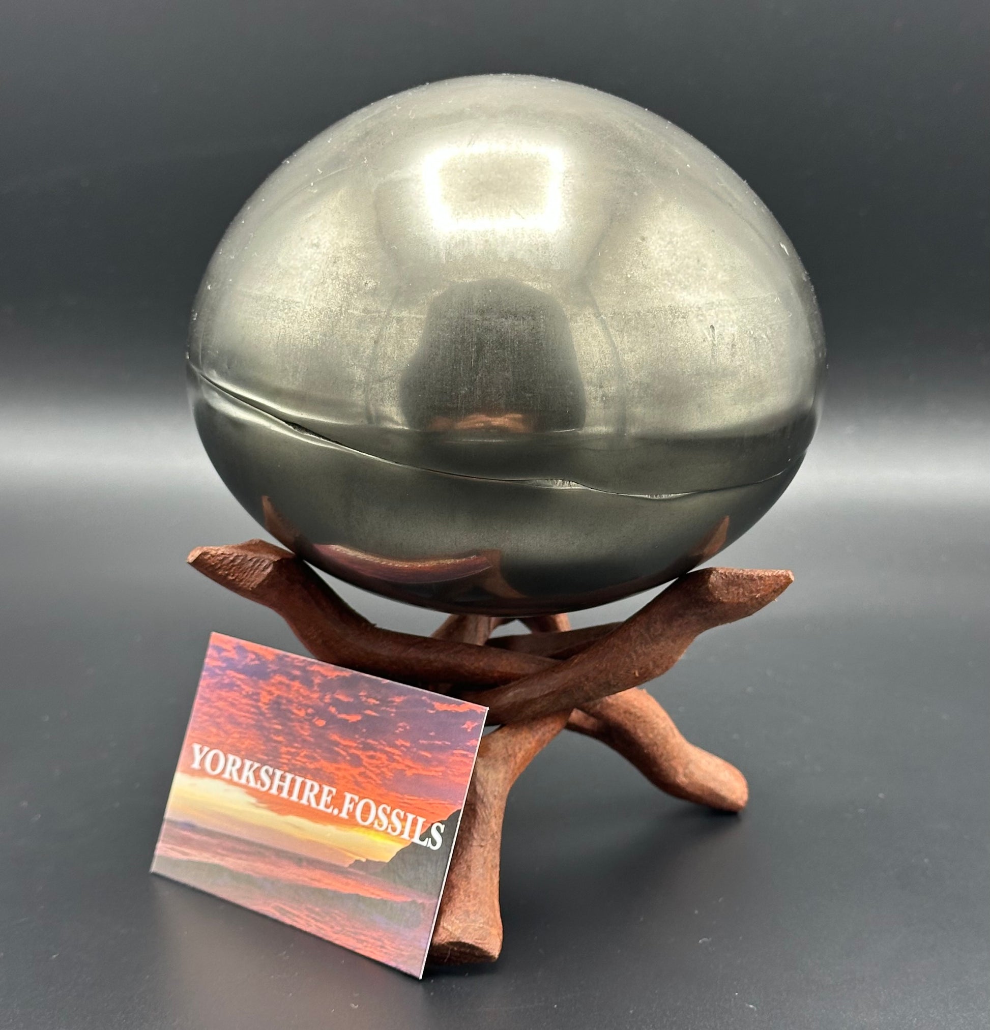 As these specimens are so hard to come by we have also taken the time to prepare some IMPLANT specimens where we have taken a Yorkshire or Madagascan ammonite or bone and set it into one of the empty Golden Egg nodules. Each specimen will be labelled with either (GENUINE) or (IMPLANT) so you know whether you are looking at a natural ammonite in the rock or one we have set into the stone. Both take an equal amount of time to prepare and are amazing display and conversations pieces. Each specimen will come with an information sheet and a polishing cloth to keep your fossil in great condition. Before handling the specimen we recommend either washing your hands or wearing gloves to avoid grease marks and tarnishing the polished pyrite layer to keep the specimen in the best condition possible. Also, avoid getting the specimen wet or storing in a damp environment, keep dry to keep the specimen in the best condition.