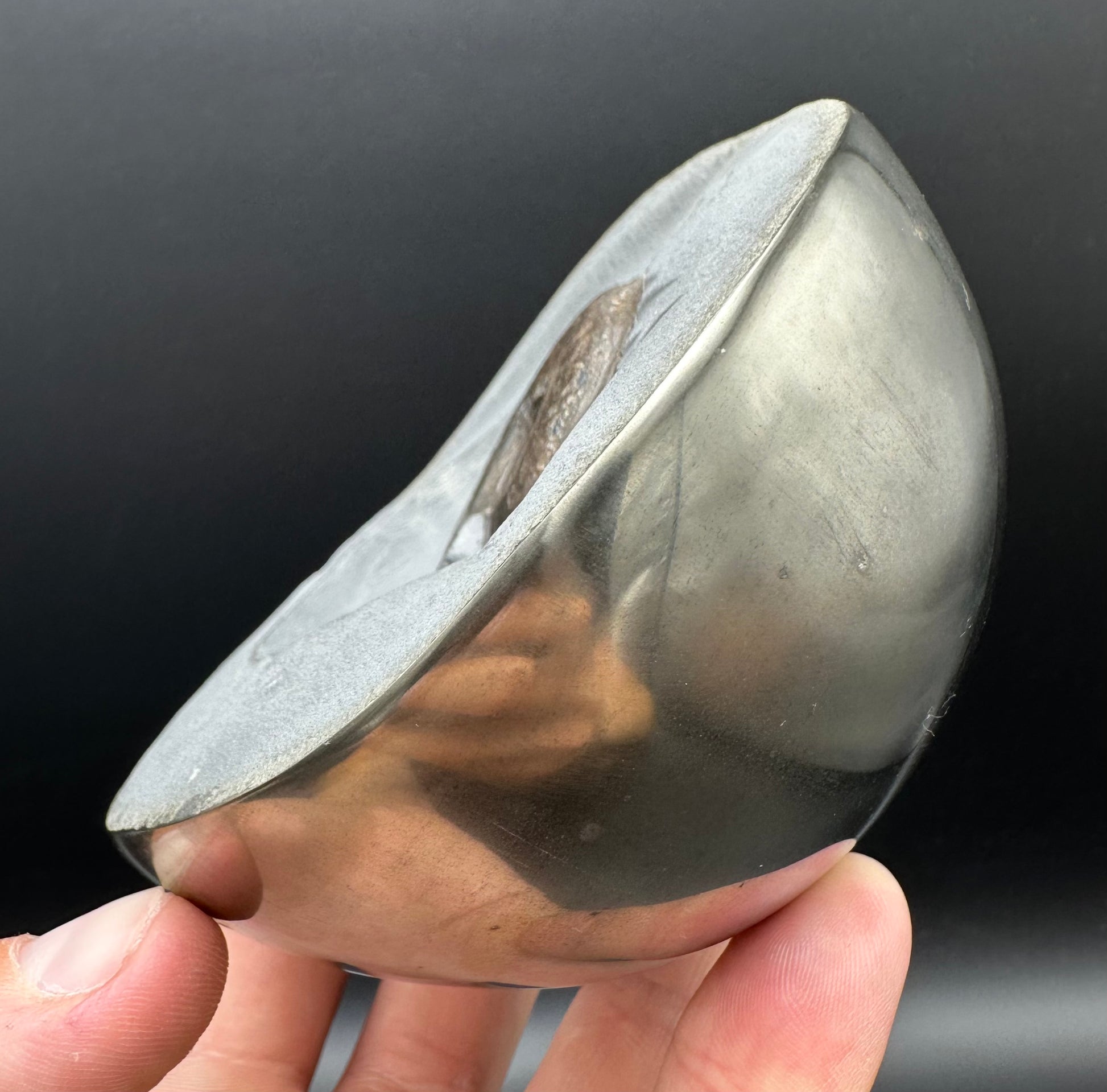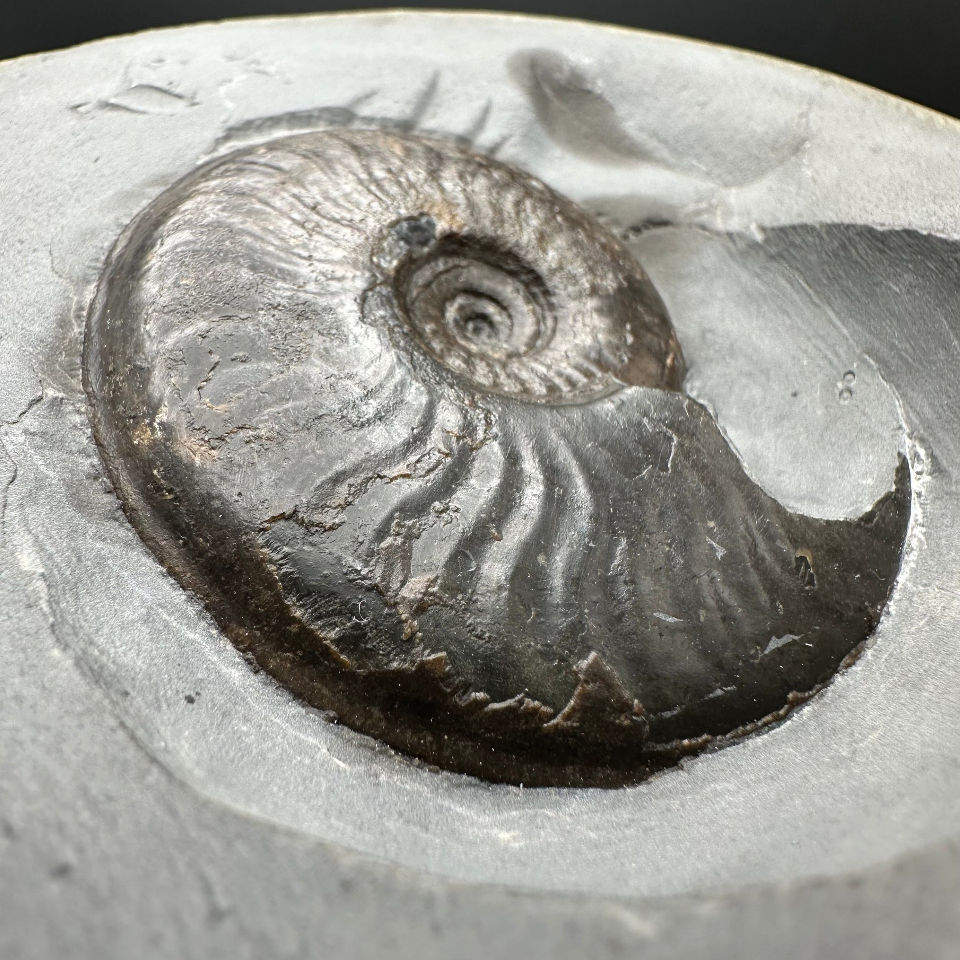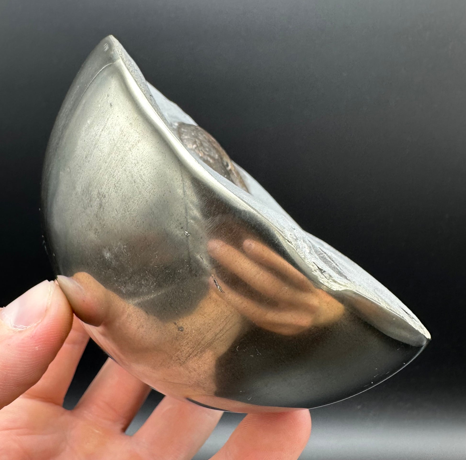 Golden Eggs are rare fossil bearing limestone nodules with a naturally occurring iron pyrite shell, commonly known as “fools gold”. Few nodules contain the Eleganticeras elegantulum ammonites we expect to see and even fewer are good enough to reach the final polishing process. The polishing stage takes many hours but eventually we are left with this luxurious golden shine.