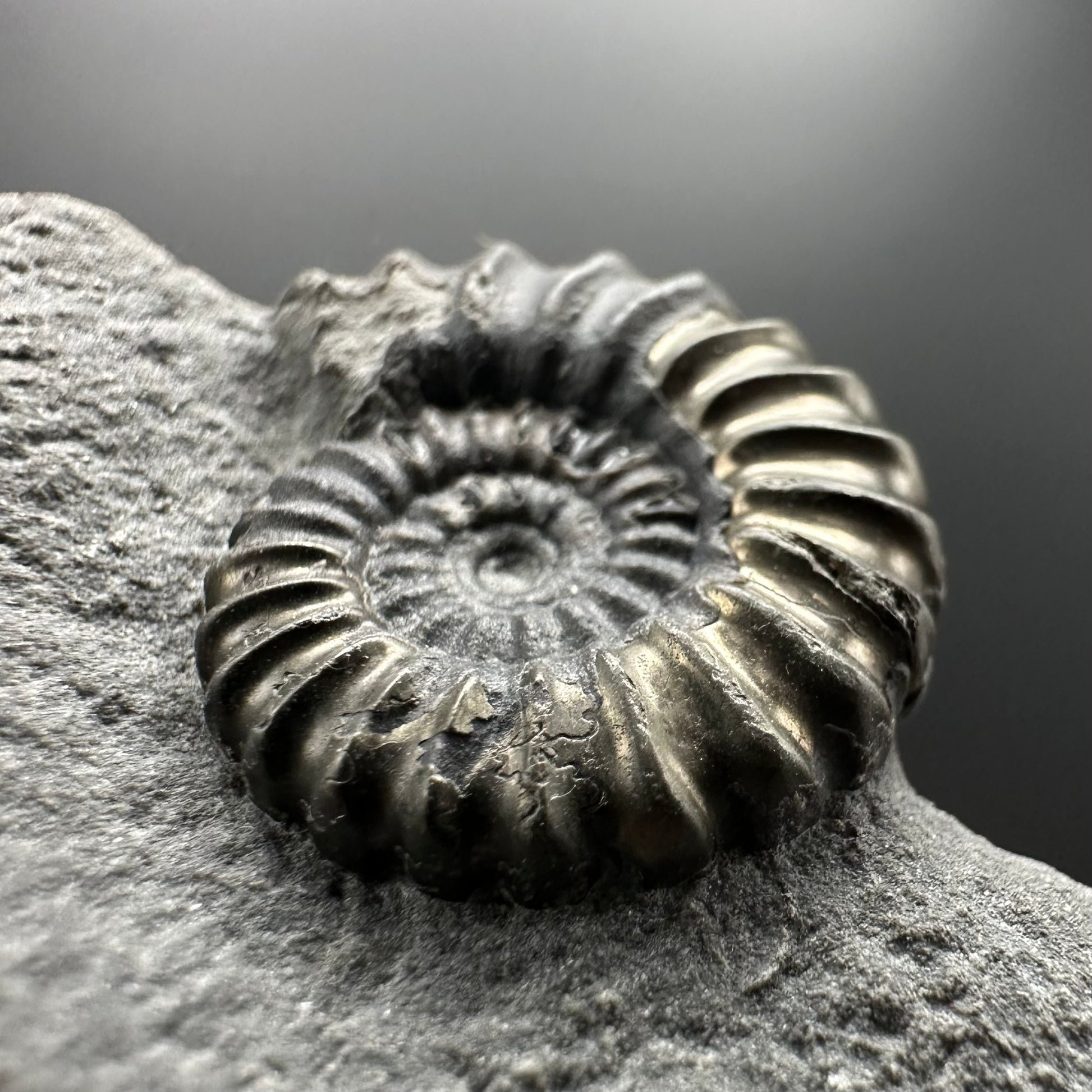 Promicroceras ammonite shell fossil with box and stand - Whitby, North Yorkshire Jurassic Coast Yorkshire Fossils