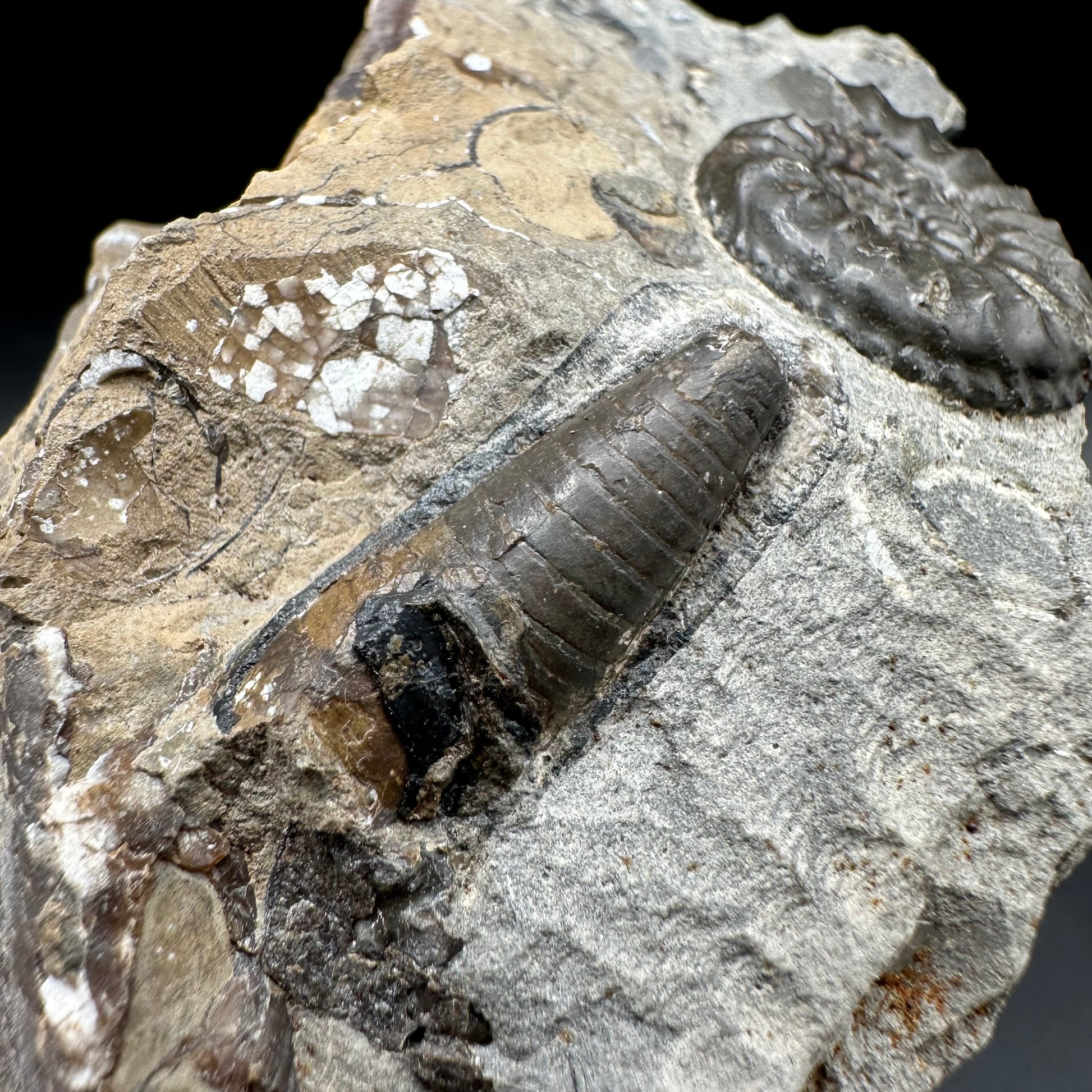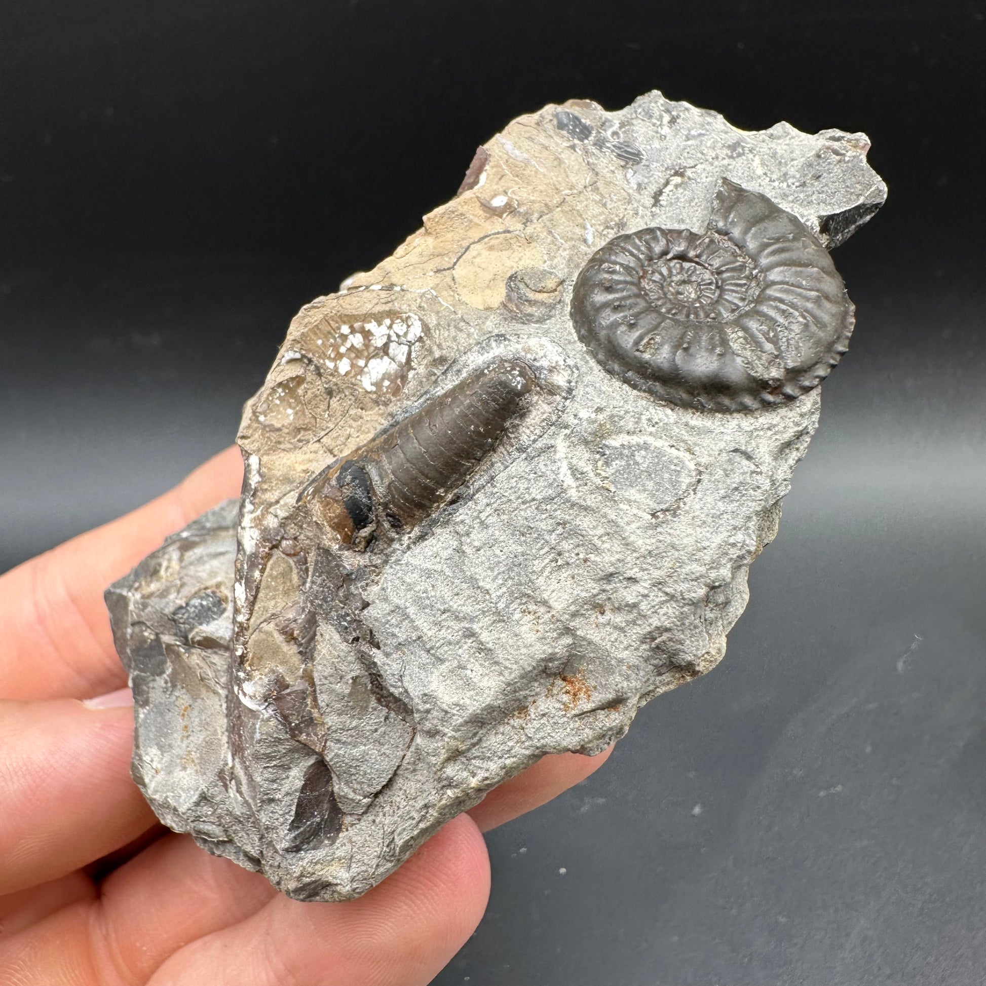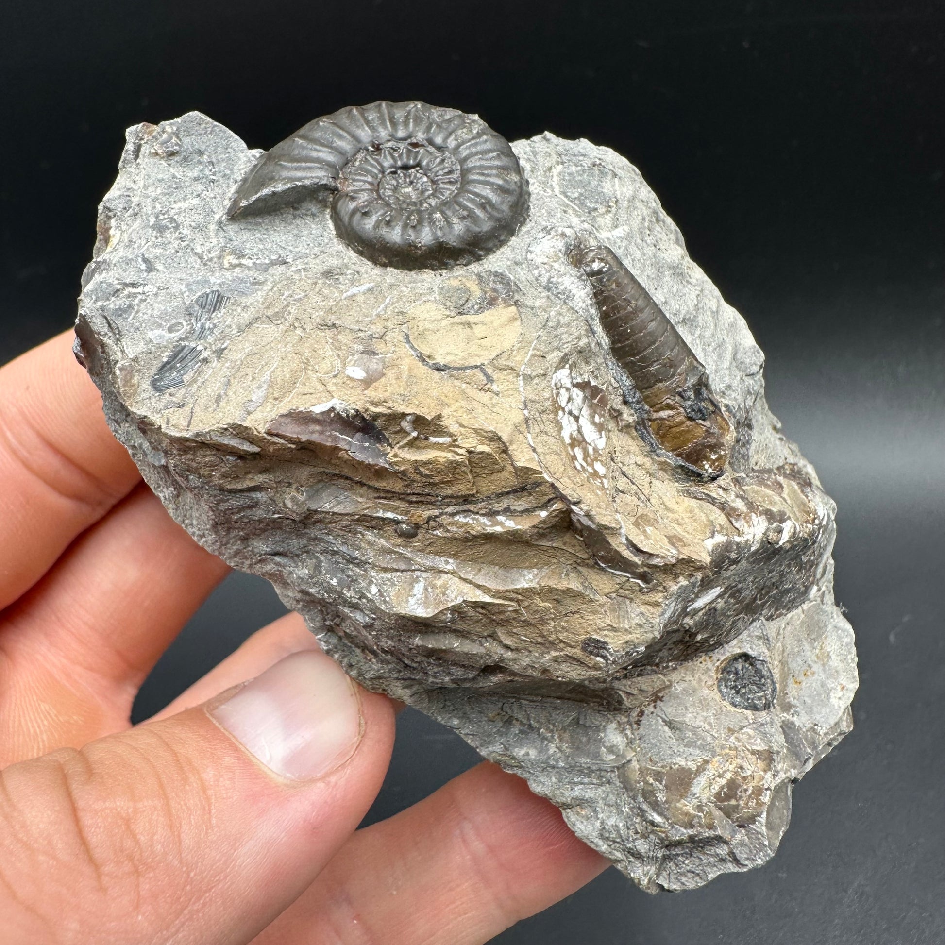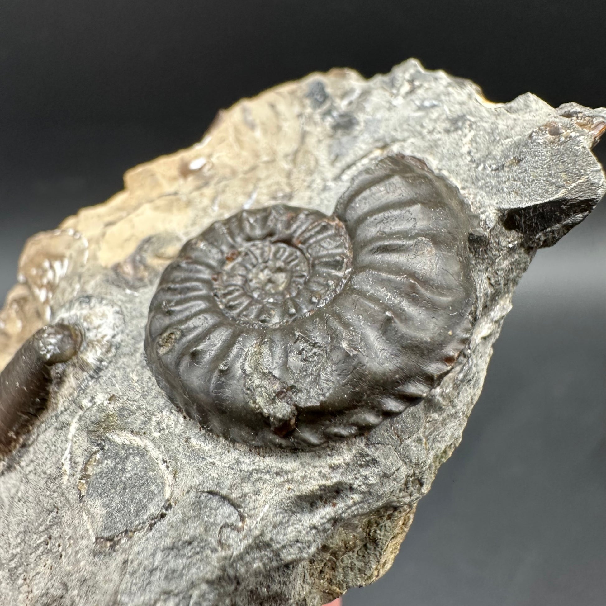 Amaltheus subnodosus Ammonite fossil / Belemnite Phragmocone fossil with box and stand - Whitby, North Yorkshire Jurassic Coast Yorkshire Fossils