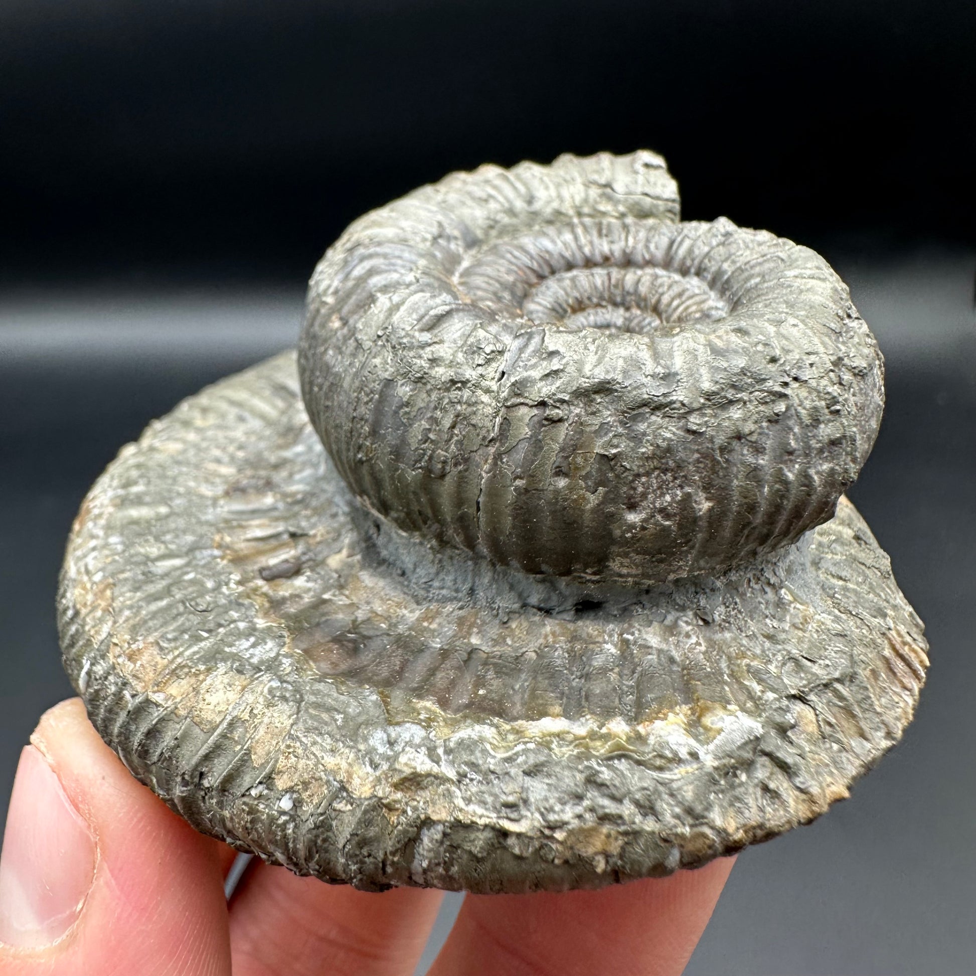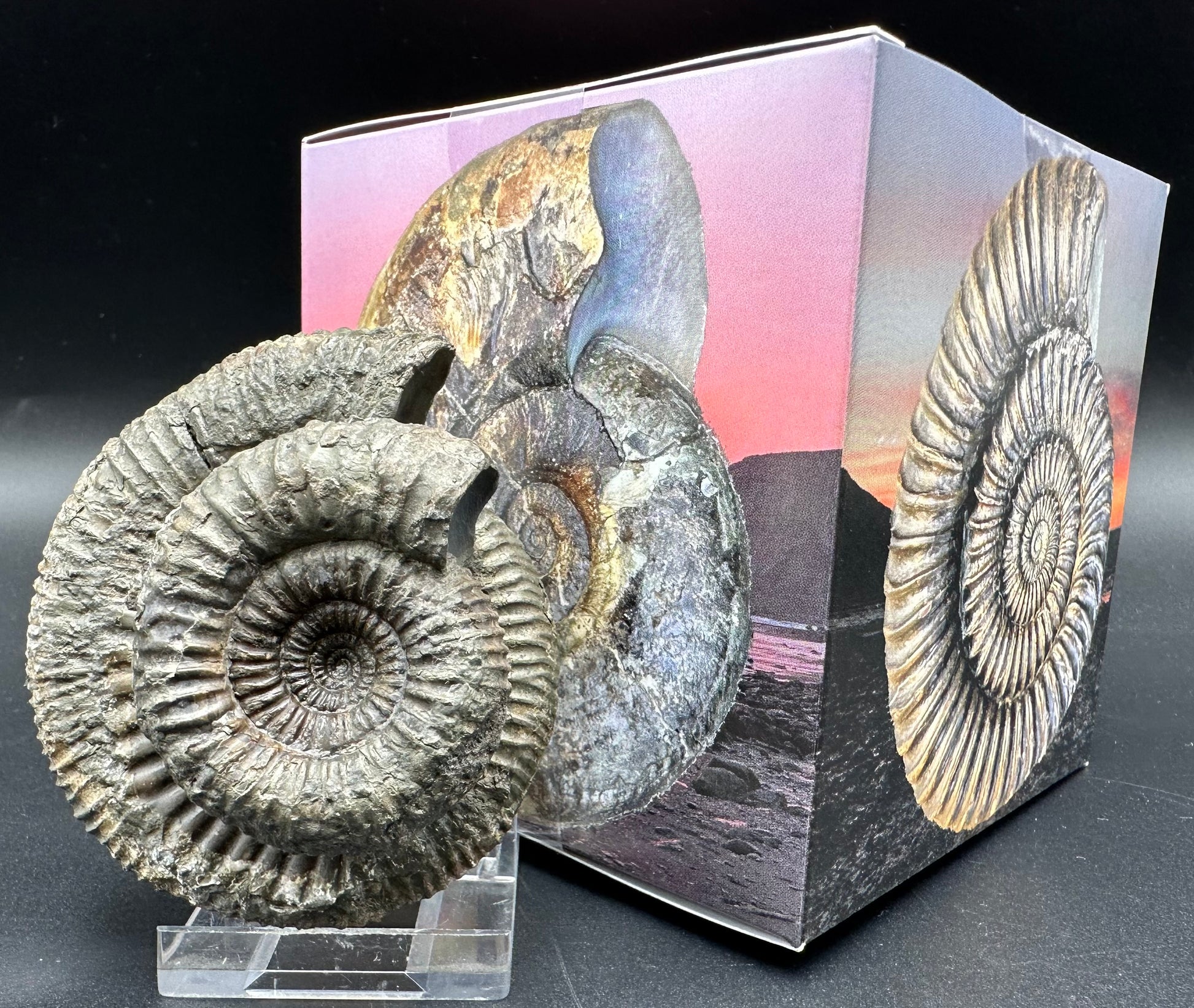 Catacoeloceras Sp. ammonite fossil with box and stand- Whitby, North Yorkshire Jurassic Coast Yorkshire Fossils