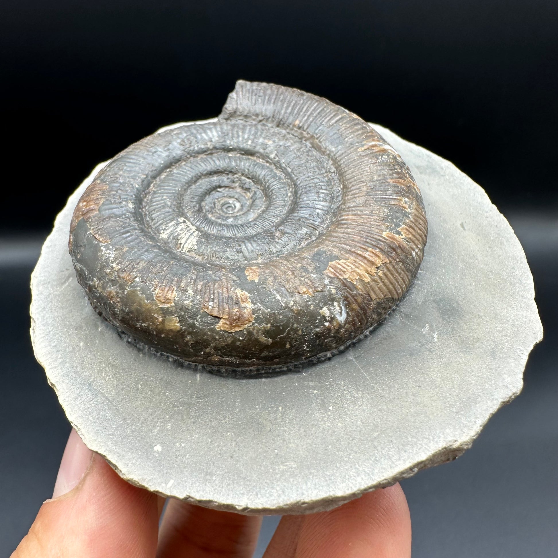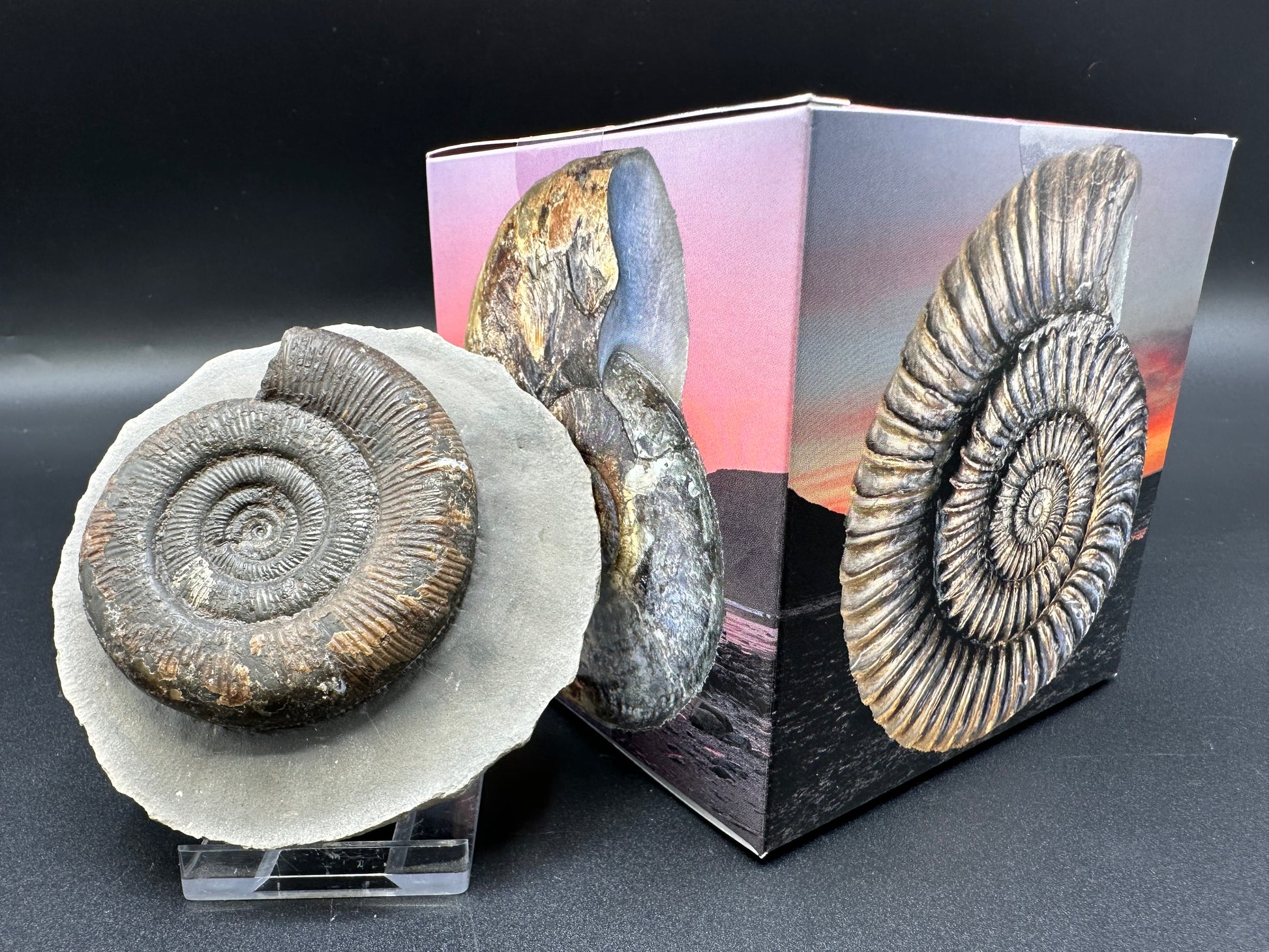 Dactylioceras tenuicostatum ammonite fossil with box and stand - Whitby, North Yorkshire Jurassic Coast