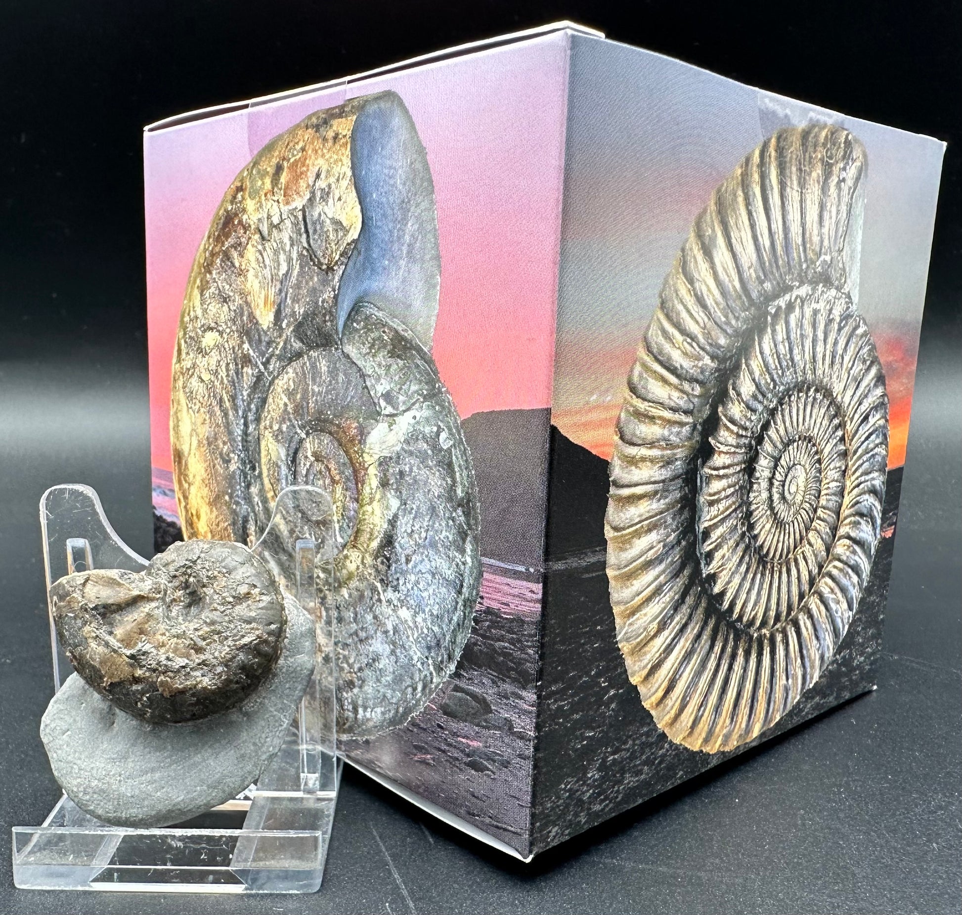 Frechiella ammonite fossil with box and stand - Whitby, North Yorkshire Jurassic Coast Yorkshire Fossil