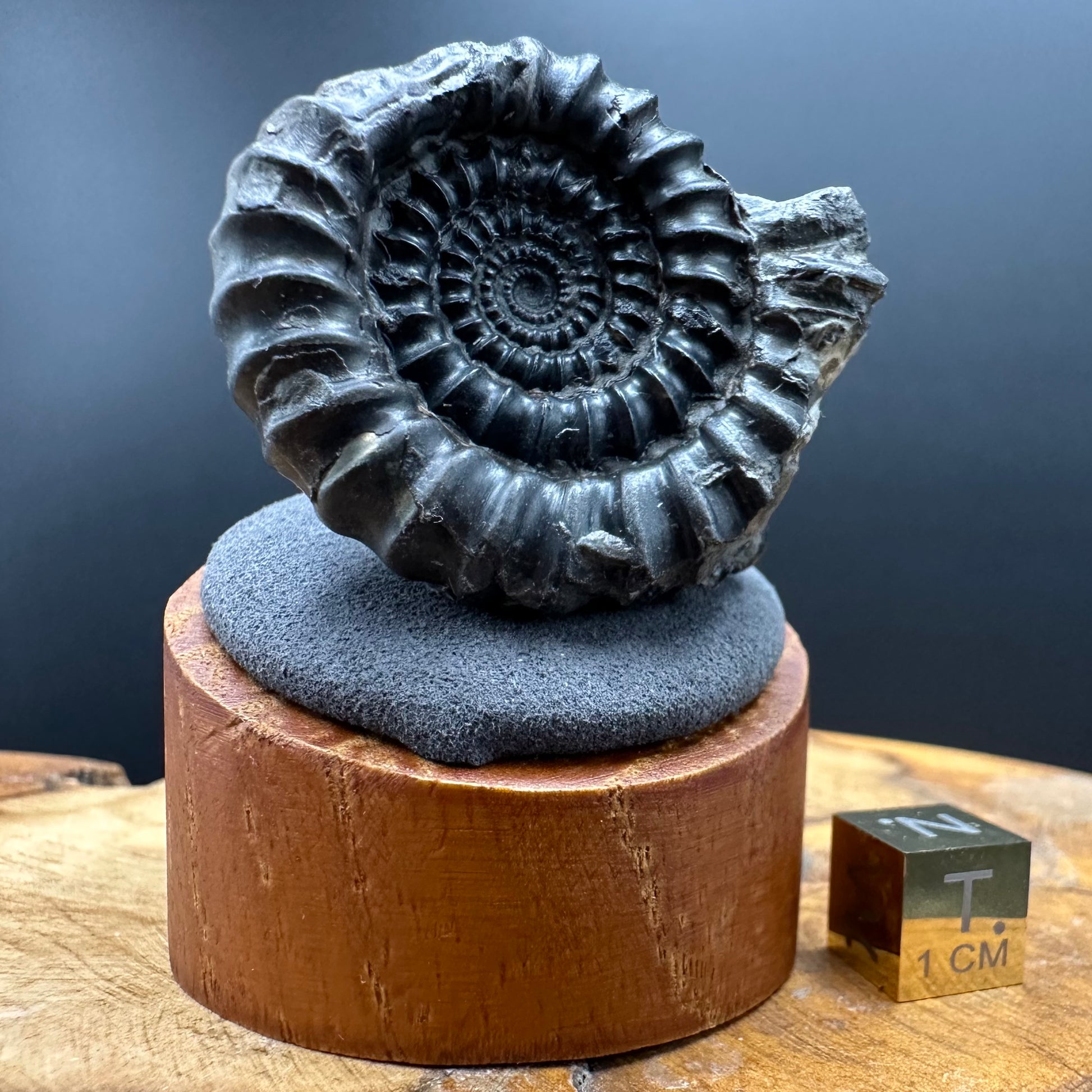 Ammonite fossil for sale with box and stand (clear stand included / wooden stand in photo for illustrative purposes only) found near Whitby, North Yorkshire on the Jurassic Coast