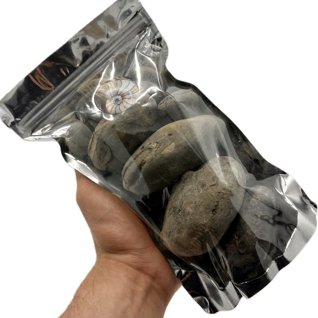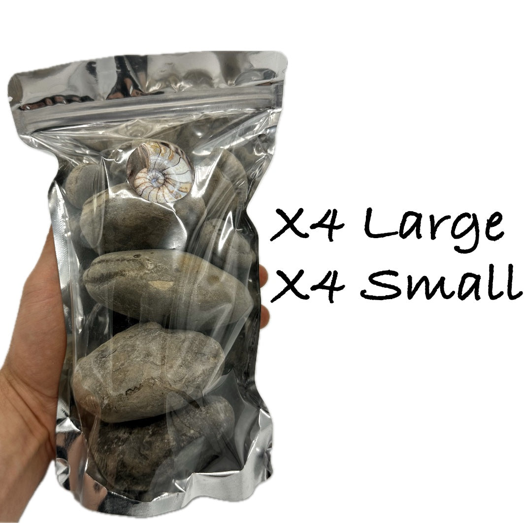 4 randomly selected large nodules with guaranteed ammonites. (SIMILAR TO SEEN) We send bundles of nodules rather than singular specimens to maximise your chances of success. Whilst we select the specimens most likely to split we cannot guarantee every nodule will open perfectly. These large nodules come with x4 small ammonite nodules to practise with. Ammonite nodules are non-refundable after purchase.