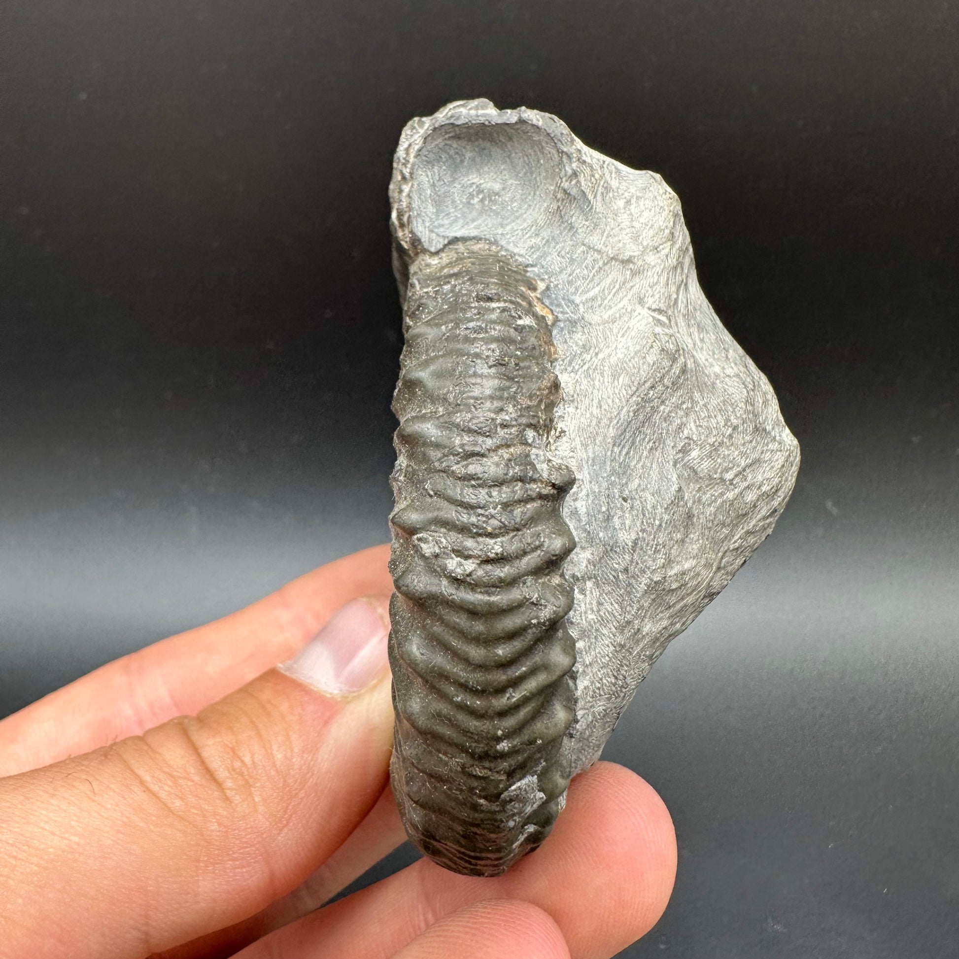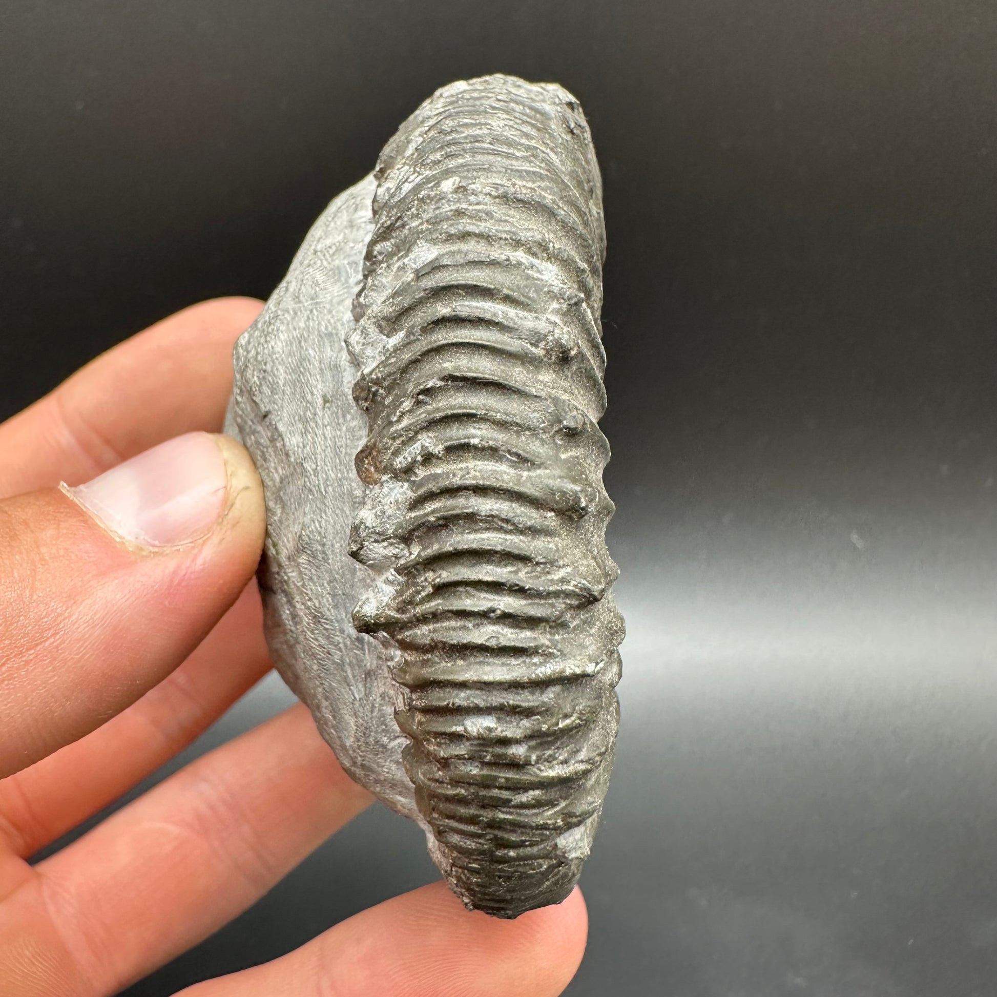 Fibulation (looped ribs) combined with spines is usually a particular feature of most Peronoceras species; although fibulation is usually absent in P.perarmatum. In Yorkshire there are the more compressed (slender) finer-ribbed P. turriculatum and P. fibulatum (the former having less looped ribs on inner whorls), and then the depressed (thicker) coarser-ribbed P. subarmatum and P.permaratum (the latter usually possessing no looped ribs). To add to the confusion there are also many intermediary forms. On all these species the ribs bend forward over the top, but more notably on the 2 former more slender species. Spines are usually much more robust on the thicker 2 latter species.