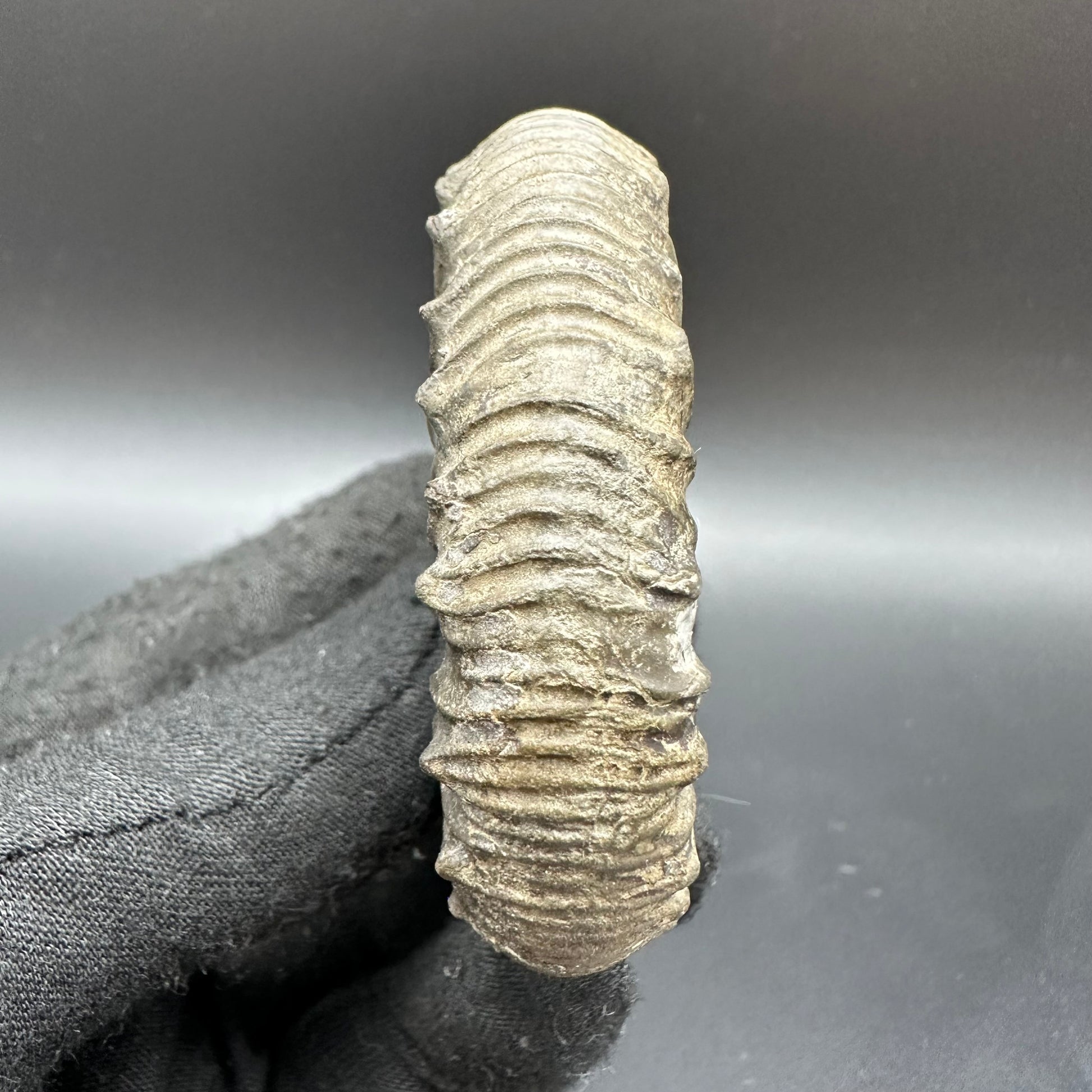 Fibulation (looped ribs) combined with spines is usually a particular feature of most Peronoceras species; although fibulation is usually absent in P.perarmatum. In Yorkshire there are the more compressed (slender) finer-ribbed P. turriculatum and P. fibulatum (the former having less looped ribs on inner whorls), and then the depressed (thicker) coarser-ribbed P. subarmatum and P.permaratum (the latter usually possessing no looped ribs). To add to the confusion there are also many intermediary forms.  On all these species the ribs bend forward over the top, but more notably on the 2 former more slender species.  Spines are usually much more robust on the thicker 2 latter species.